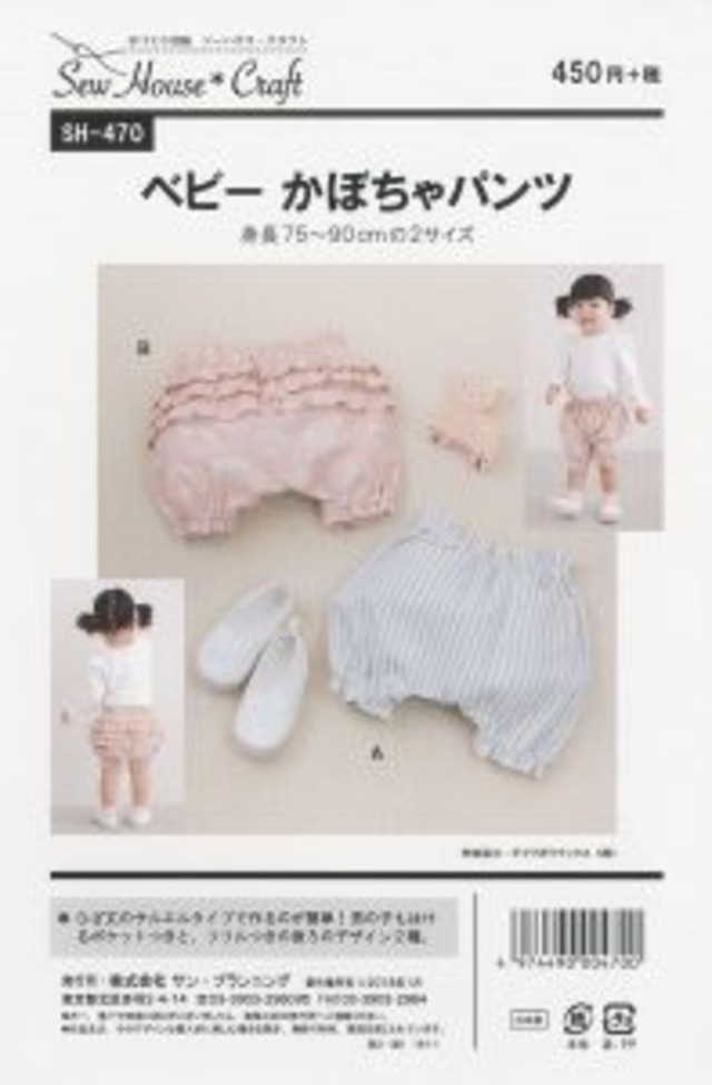 ◆型紙 パターン ベビーかぼちゃパンツ SH-470 ◆タイプ ベビー(身長75~90cm) ◆商品説明 ひざ丈のサルエルタイプで作るのが簡単! 男の子もはける後ろポケットつきと、ふっくらかわいい 後ろ3段フリルつきのデザイン2種。 身長75~82cmと83~90cmの2サイズ。 ※その他、サイズ、出来上がり寸法、必要な材料、用布量などは、 画像内の仕様をご覧ください。