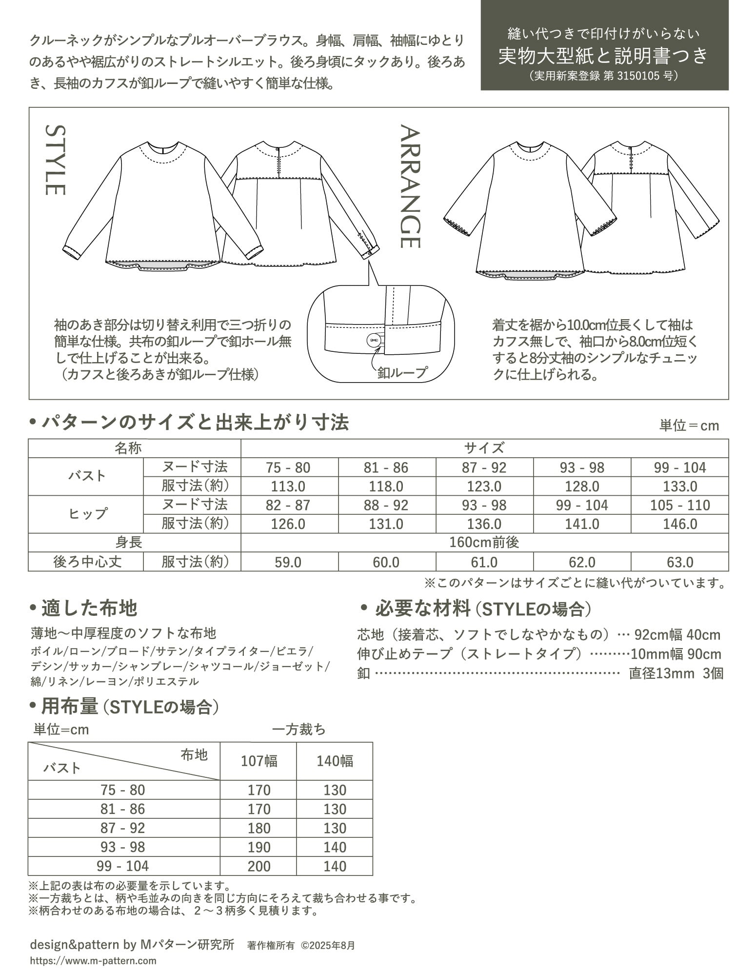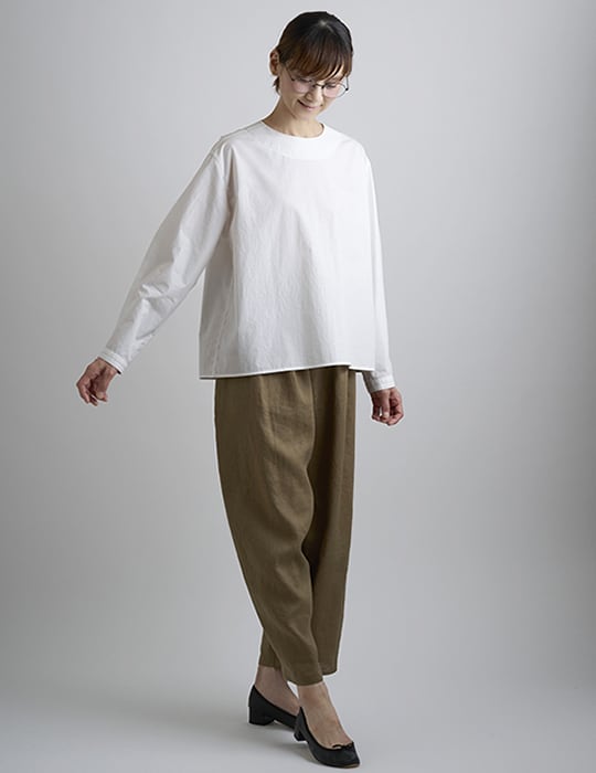 ・アレンジで、着丈を10cm 長くし、袖はカフスなしで8 分丈に短くしたシンプルなチュニックにできます。
