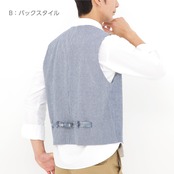 ・前身頃に簡単なつくり方の箱ポケットと後ろ身頃のベルトで目線が上がり、男女共にバランスが取りやすい着丈のクラシカルなベスト。