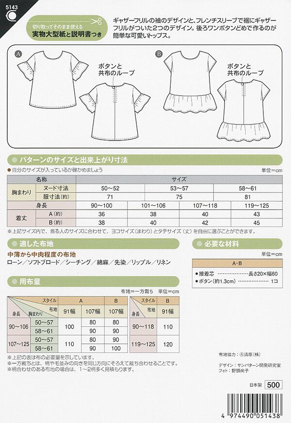 ギャザーフリルの袖のデザインと、フレンチスリーブで裾にギャザーフリルがついた2つのデザイン。 後ろワンボタンどめで作るのが簡単な可愛いトップス。 Aは、大人用「5557 フリル袖ブラウス」のAと同じデザインなので、2つの型紙で親子ペアが作れます。