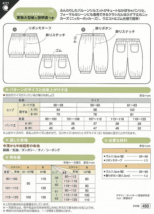 ふんわりしたバルーンシルエットがキュートなかぼちゃパンツと、フォーマルなシーンにも着用できるクラシカルなひざ下丈のニッカーズ(ニッカーボッカーズ)。 脇に接ぎがなく、ウエストはゴム仕様なので簡単!