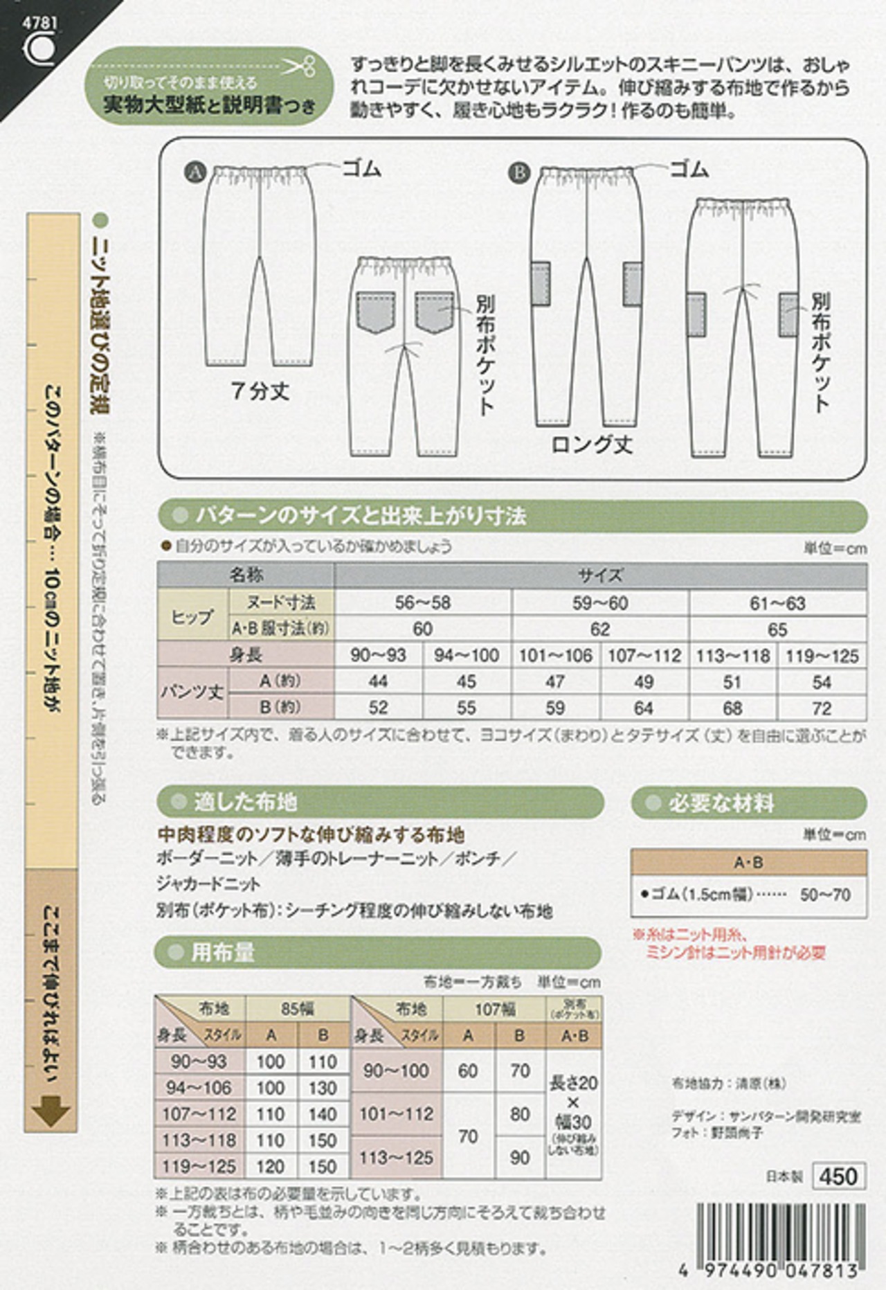 おしゃれコーデに欠かせない! すっきりと脚を長く見せるシルエットのスキニーパンツ。 伸び縮みする布地で作るから動きやすく、履き心地もラクラク! 作るのも簡単です。