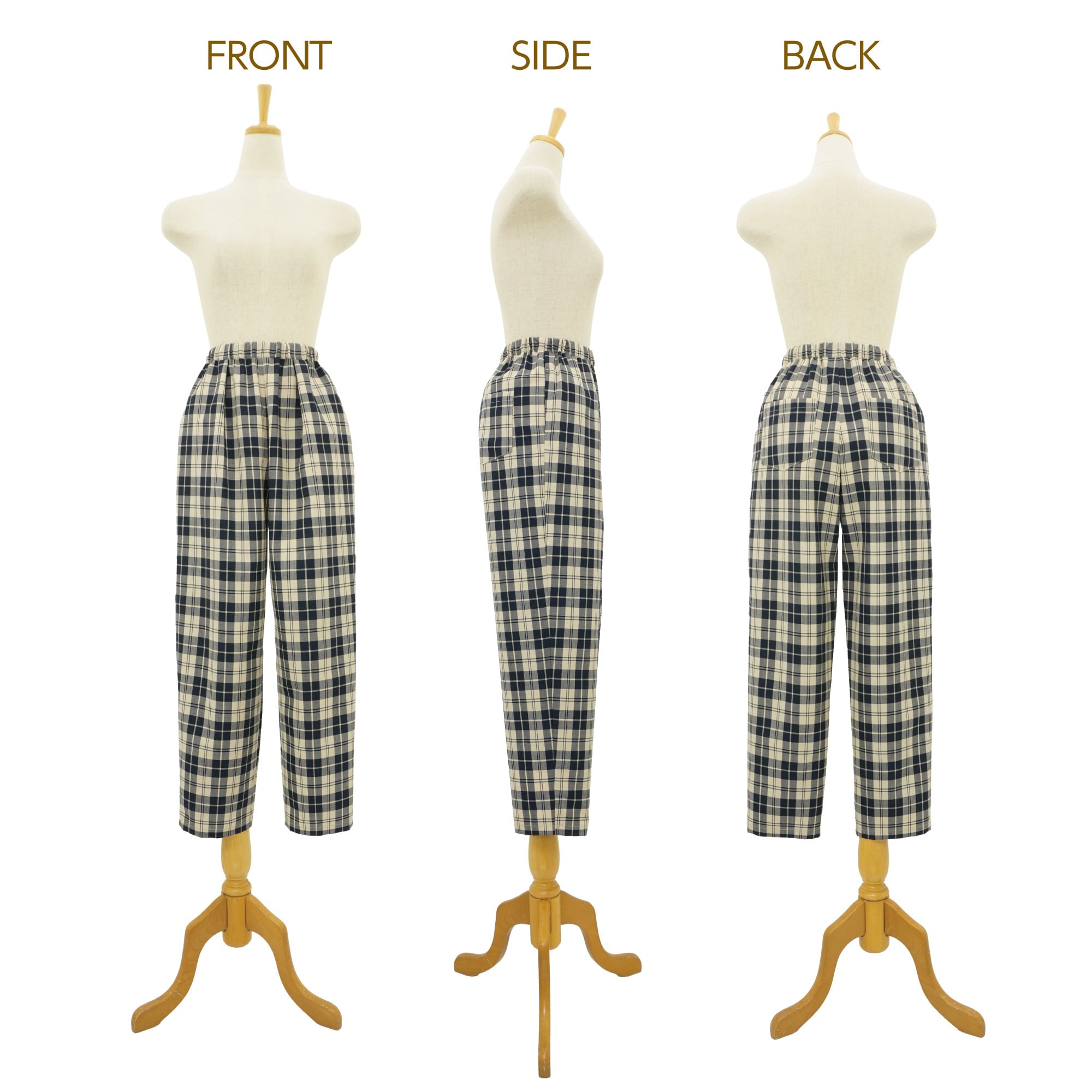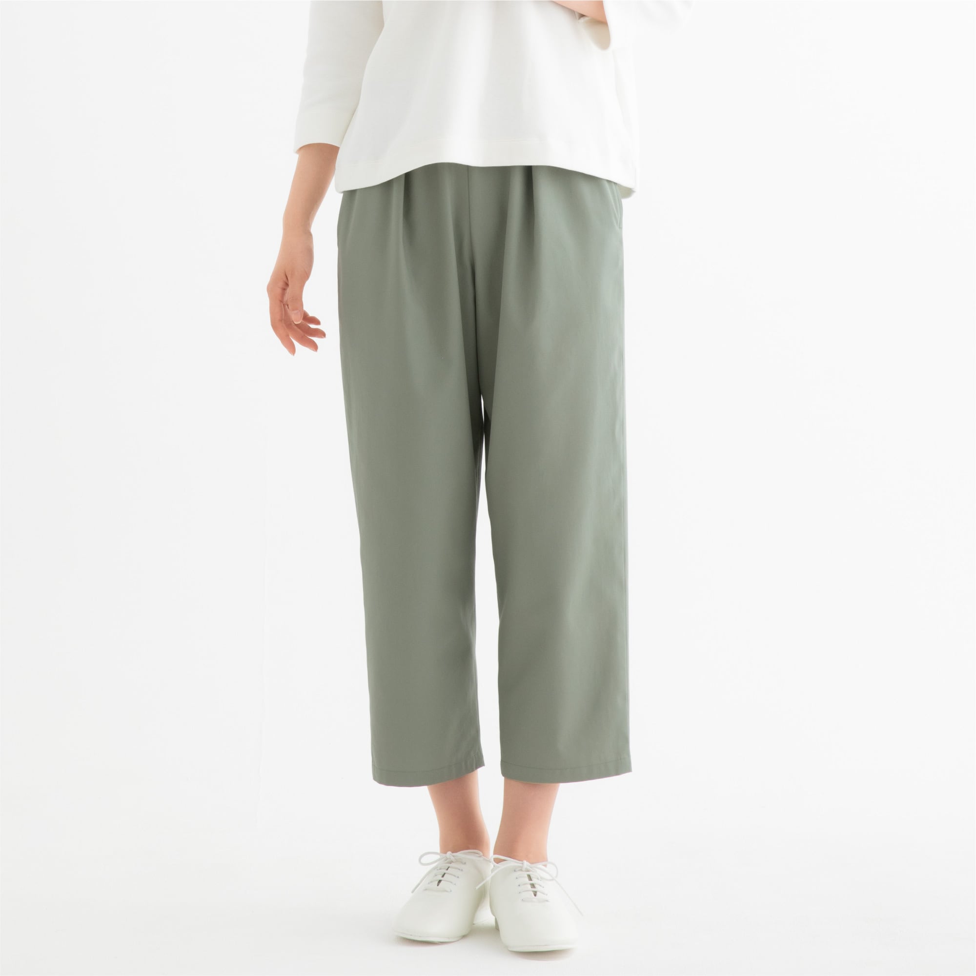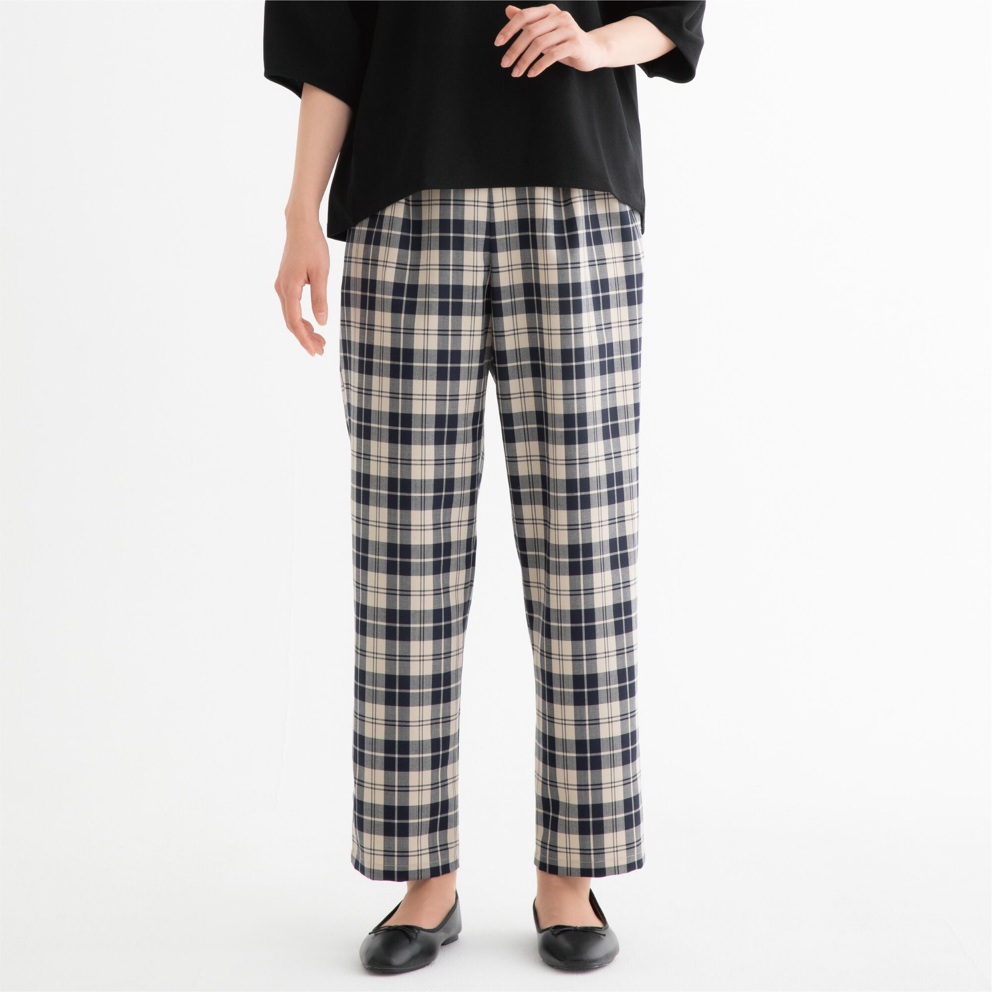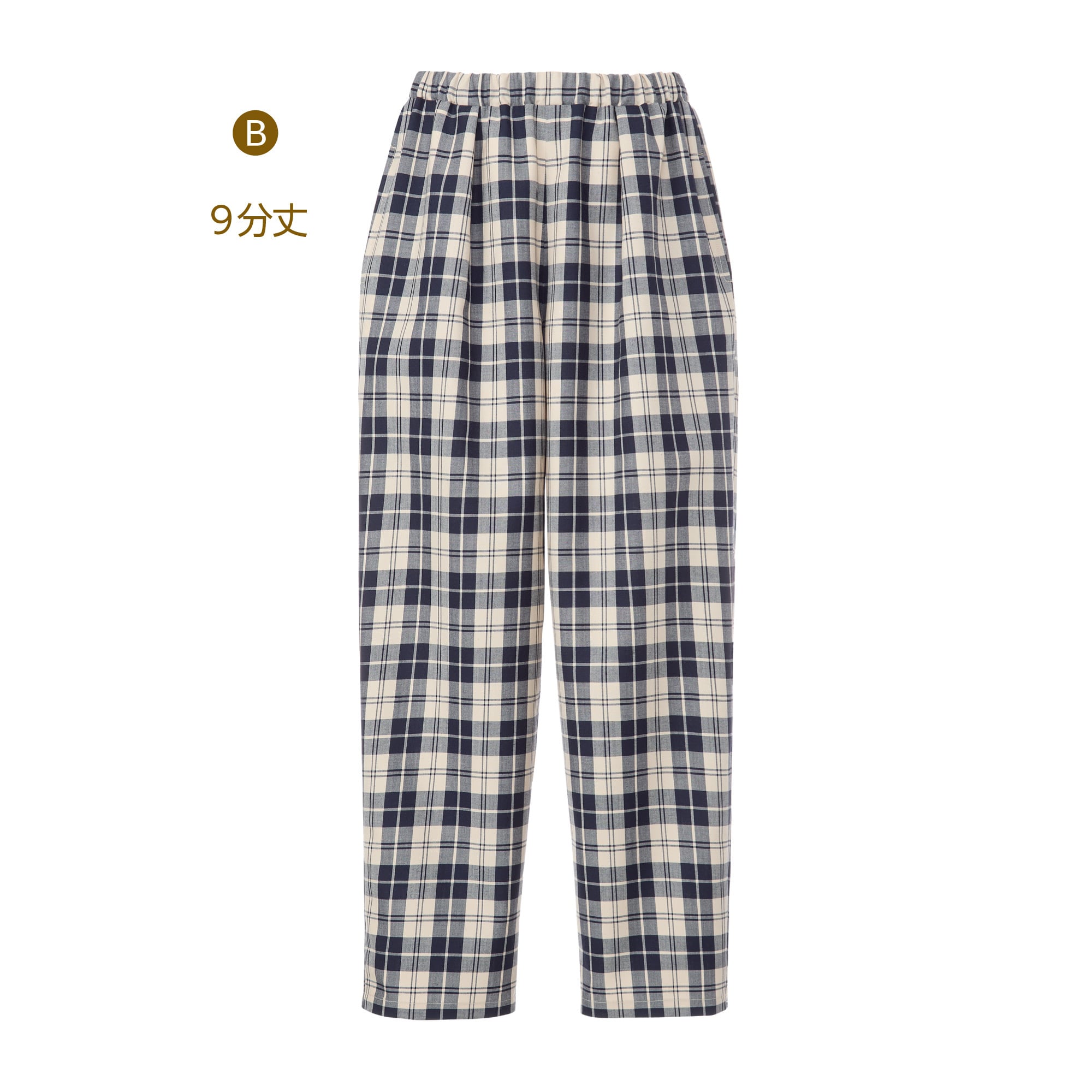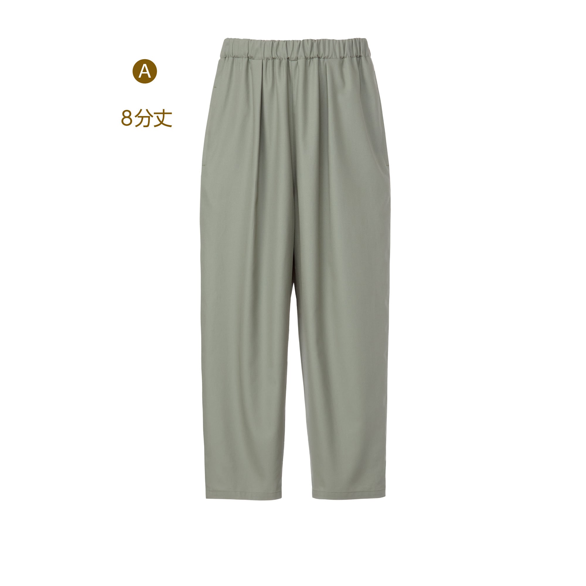 ・ゆとりのあるヒップまわりとタックでお腹の高さをカバーしたウエストゴムのパンツ。