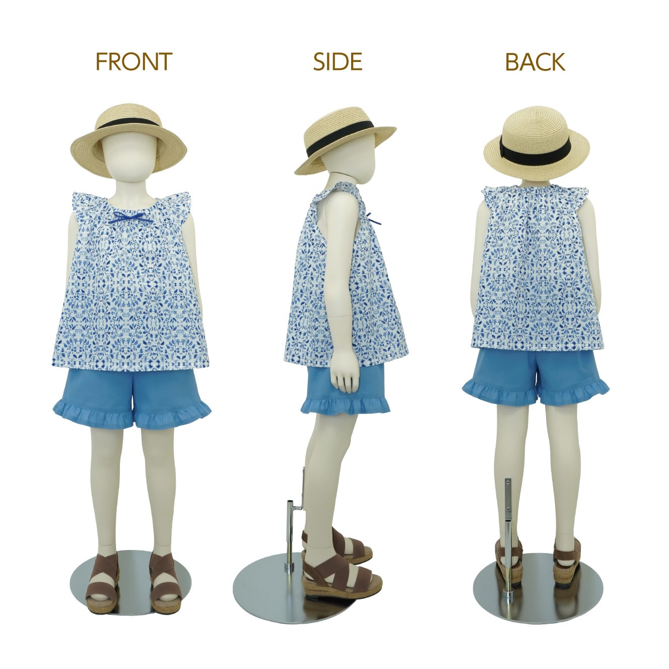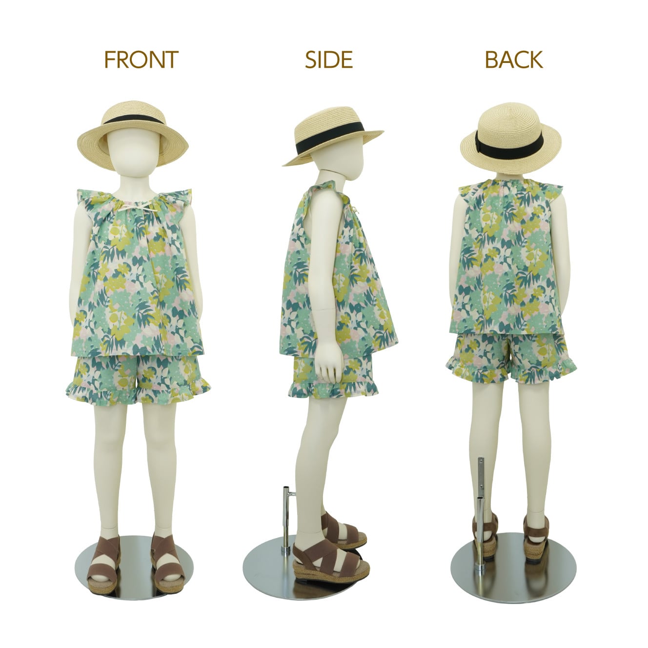 ・トップスの衿ぐりとパンツのウエストがゴム仕様で、お子様がひとりでお着替えできる夏のセットアップ。