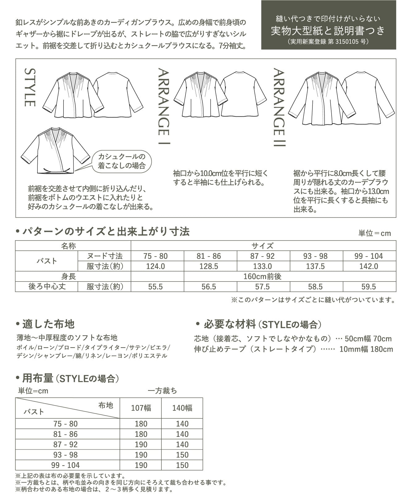 ・アレンジⅠは袖丈を半袖に、アレンジⅡは長袖にして、裾を腰周りが隠れる丈まで長くしてカーデブラウスにもできます。