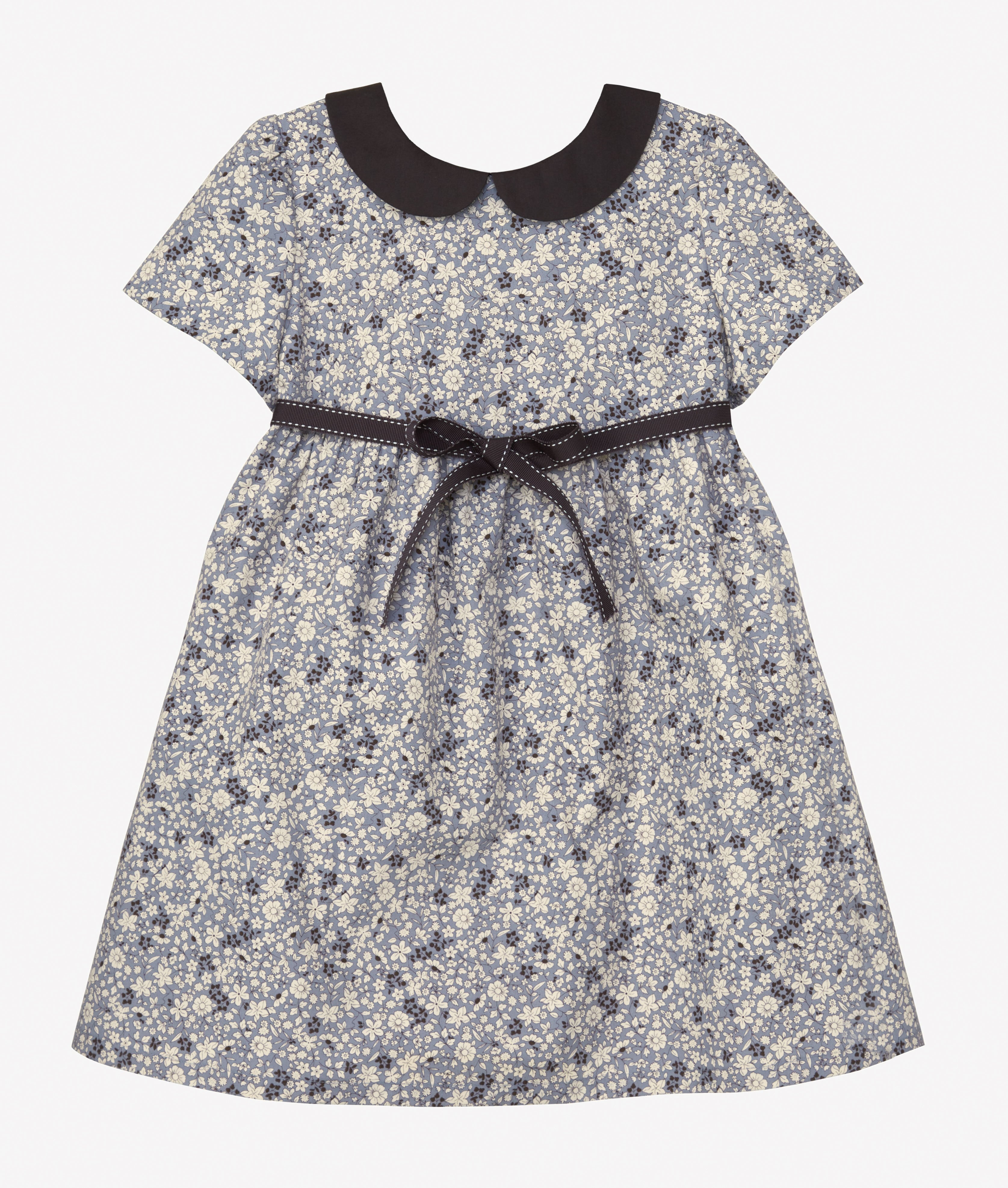 別布使いの丸衿とウエスト切り替えのギャザーがふんわり可愛い、後ろファスナーあきのスタンダードなワンピース。