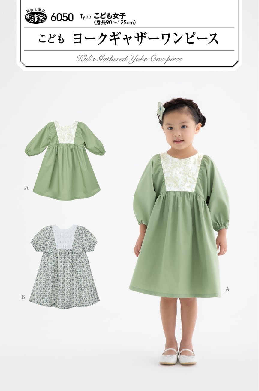 2枚仕立てのヨーク切り替えからギャザーたっぷりの袖とスカートのふんわりしたシルエットが可愛さを引き立てるワンピース。 表ヨークの別布使いがアクセント。 着丈はひざ丈で、袖口にゴムを入れた9分袖と5分袖が選べます。