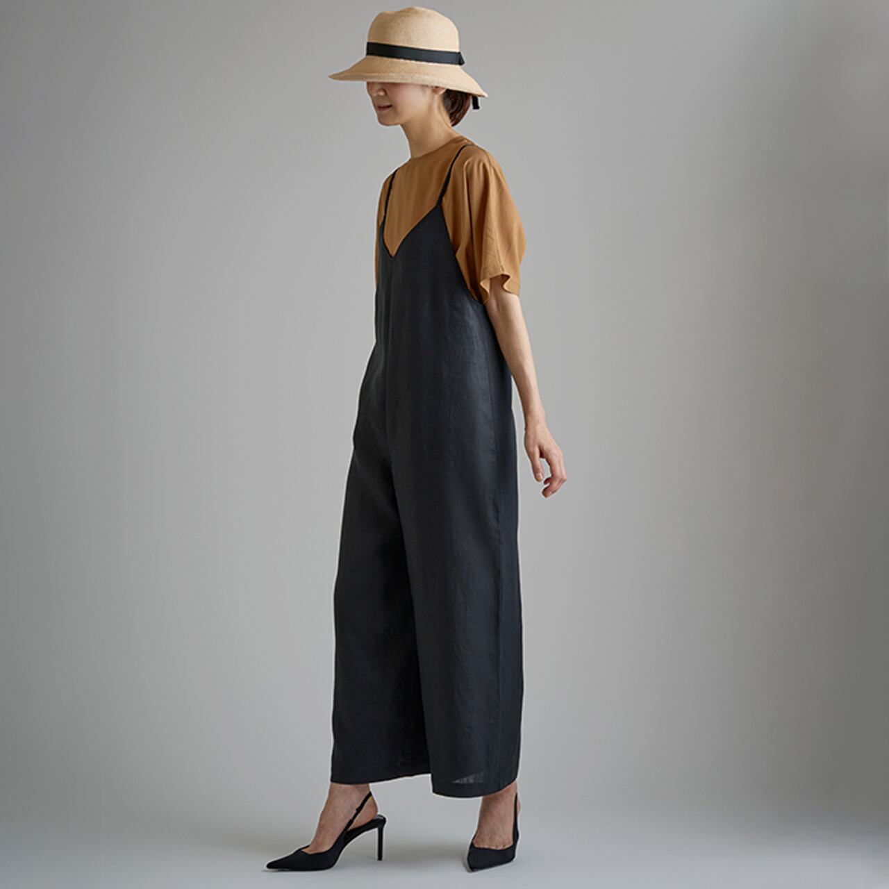 ・キャミソールの身頃にワイドストレートシルエットのパンツが一体になったようなバランスのサロペットパンツ。